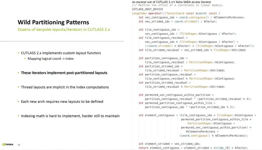 针对不同的内存访问模式, CUTLASS 2.x做了大量的抽象, 从逻辑上的坐标映射到访问内存offset index, 如何实现分块的数据访问迭代, 以及如何进行线程到数据block的映射, 针对每一代的硬件架构, 都还要定义新的Layout, 然后这些东西也非常难以维护.