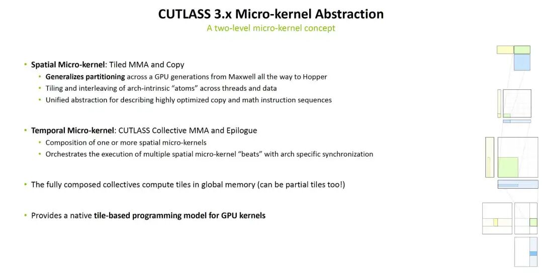 Cutlass 3.x通过TiledMMA和TileCopy隐藏了内部不同硬件架构的实现, 通过时空两种micro kernel的划分很好的抽象了工作流,同时通过CuTe Layout代数的灵活性, 构建了一个相对容易的可组合算子框架.