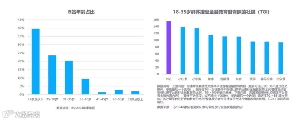 B站用户年龄结构呈现明显的年轻化趋势,年轻用户更倾向于在B站获取金融相关内容。B站2024年半年报数据显示,35岁及以下用户占比超过80%,构成了B站的核心用户群体。与此同时,这一群体在社会生产活动中占据重要地位,正处于资本积累的初期或中期阶段,具有较大的金融需求潜力。随着收入水平的提升和财富的积累,他们对理财、保险、信贷等金融产品的需求将持续增长。金融机构可以借此机会提前布局,通过B站培养年轻用户对金融品牌的认知和信任,为未来的业务发展奠定基础。