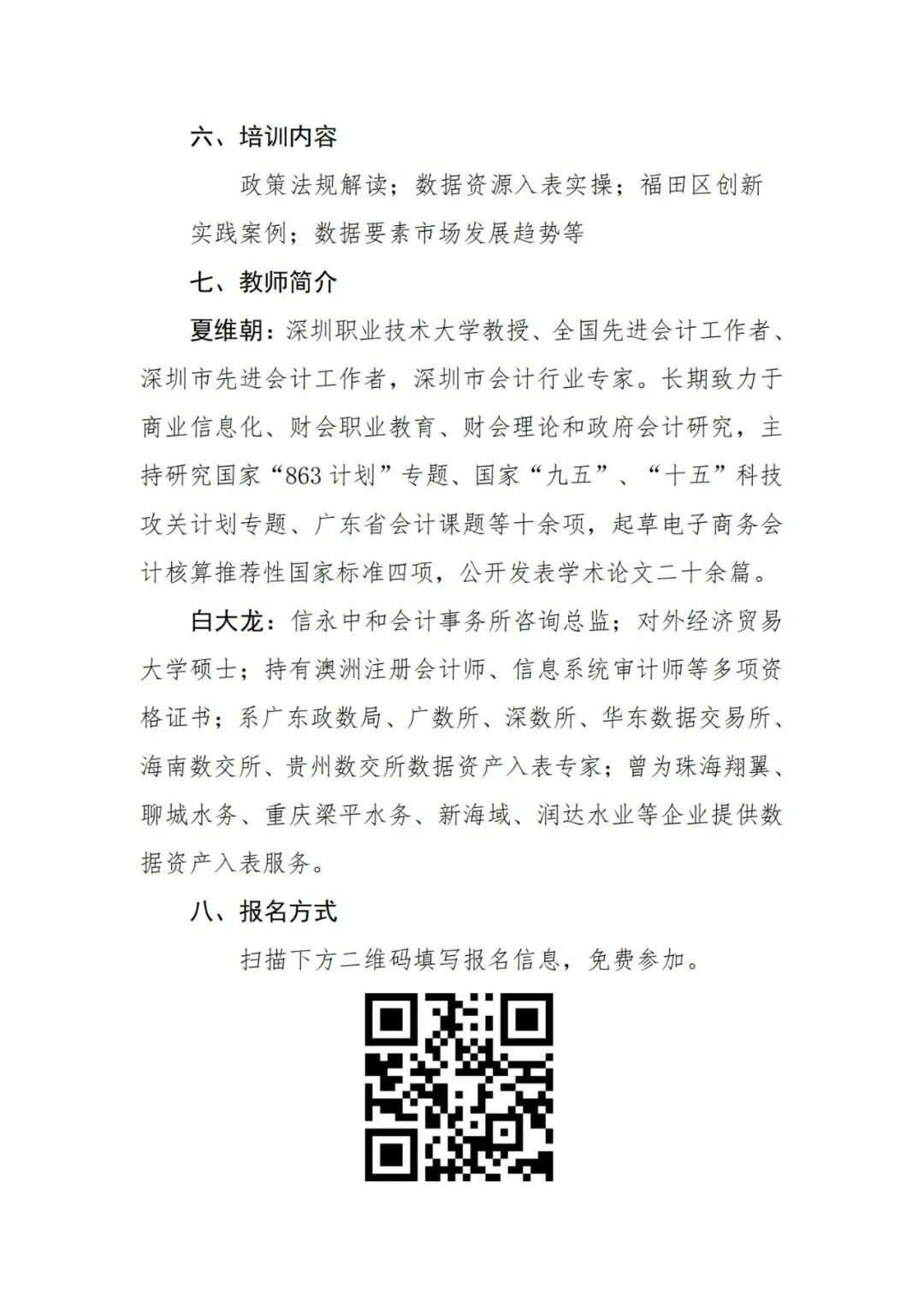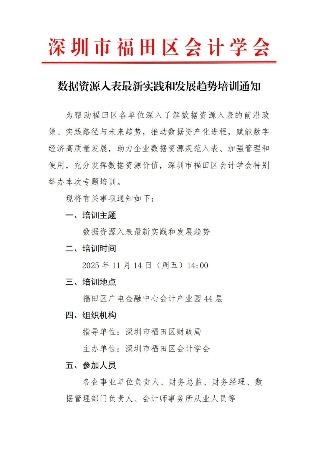 为帮助福田区各单位深入了解数据资源入表的前沿政策、实践路径与未来趋势,推动数据资产化进程,赋能数字经济高质量发展,助力企业数据资源规范入表、加强管理和使用,充分发挥数据资源价值,深圳市福田区会计学会特别举办本次专题培训。
