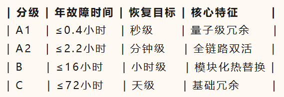 数据中心可用性 data center availability:数据中心能够保障电子信息设备可持续运行的能力,在基础设施发生故障的情况下,也能够保障电子信息设备不间断的运行。