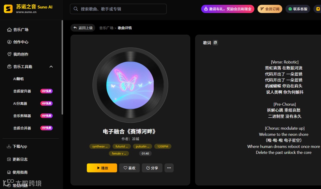流派风格:synthwave, futuristic, pulsating bass, 120BPM, female vocals with autotune