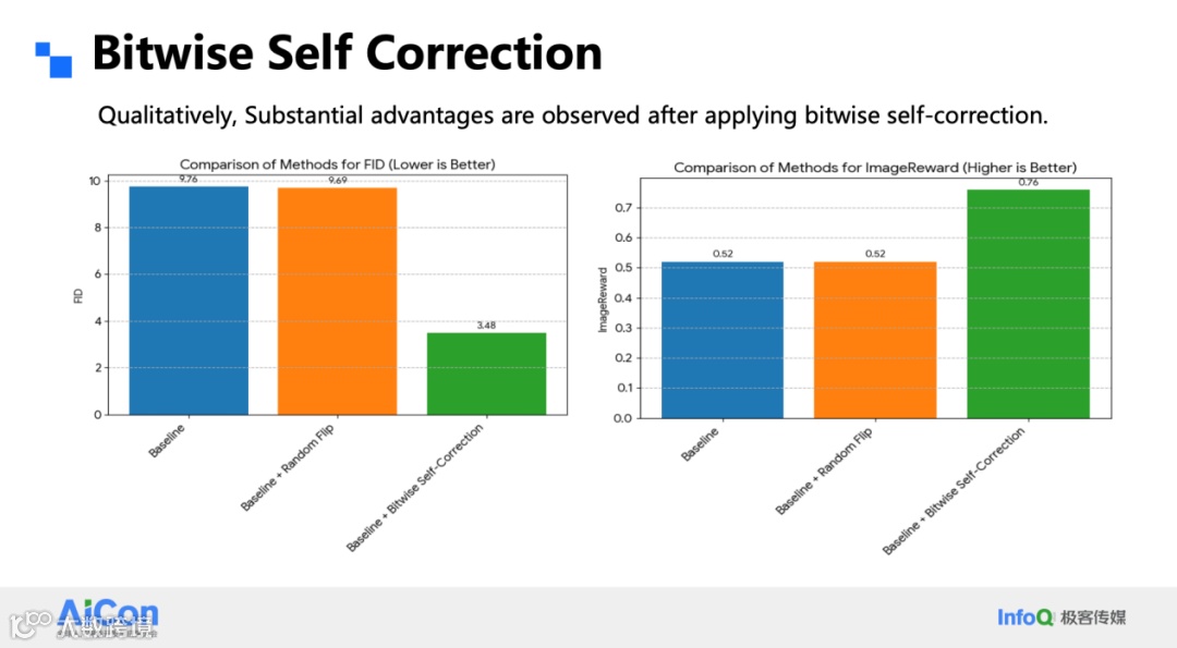 为了弥合训练 - 推理的不一致,我们在训练阶段显式模拟预测误差。做法很简单:把 1×1 token 在通道维展开后,随机翻转 20 % 的比特符号,再用被扰动的重建特征继续下一级量化。这样网络在每一步都能学会纠正位级错误,推理时误差不再逐级放大。加入这一 self-correction 后,同参数下的 FID 从 9 掉到 3,ImageReward 同步抬升;在高步数、高分辨率设置下,肉眼也能看出明显差异。