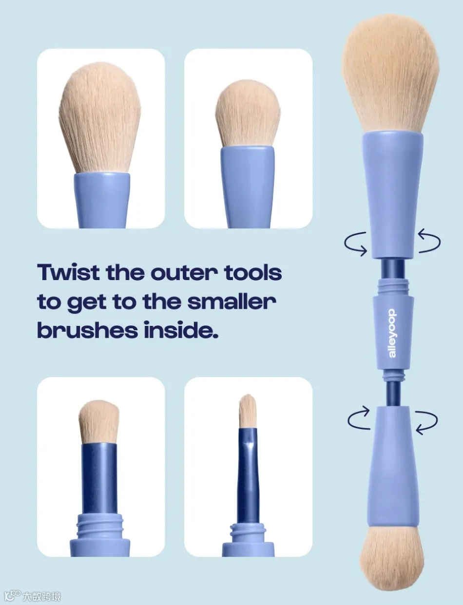 值得注意的是,Alleyoop推出了多款便携+多功能属性的产品,品牌似乎瞄准了热衷于在旅途中精简行李的人群。比如多合一化妆刷,一只刷子拆开后内含4个不同刷头,基本可以满足所有面部化妆需求。目标是差旅人群的卖家可以关注品牌官网,获取产品灵感。