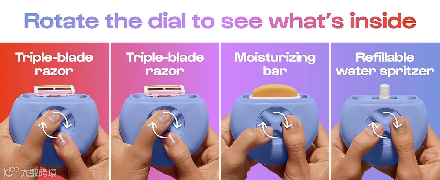 脱毛刀本身属于常规产品,这款多合一便携脱毛刀在常规产品的基础上做了创新设计,体积小巧,大约等于一个手掌心,内含2支刀片、1个保湿棒和1个喷雾瓶,旋转使用。亚马逊目前售价$15,来自在海外多次获得美容奖项的新兴品牌Alleyoop。