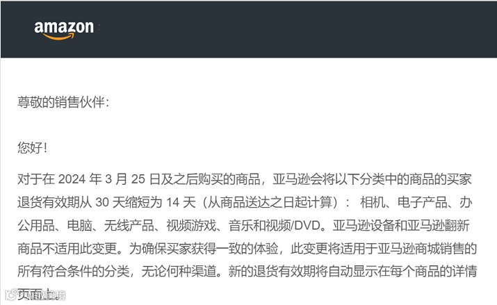 现今亚马逊宣布,在2024年3月25日及之后购买的商品,部分商品的买家退货有效期从30天缩短为14天(从商品送达之日起计算)。无论是自配送还是FBA,都适用于这项新规。