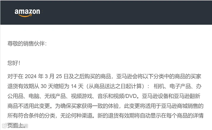 似乎是为了安抚客户情绪,亚马逊制定了一个过渡期,2024年3月25日至2024年4月25日期间,买家仍可以按照30天退货有效期要求退货,4月25日起,送达超过14天的买家就不能再申请退货了。