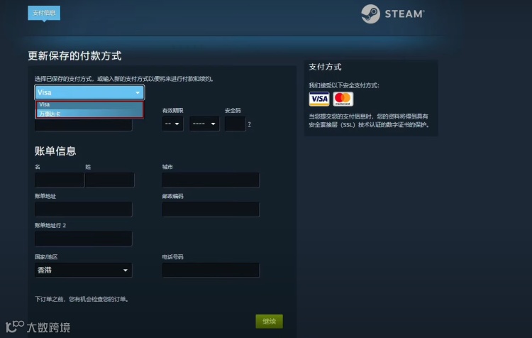 由于注册的是外区的账号,并不支持国内常用的微信、支付宝及银联等方式,只支持添加visa、万事达卡。