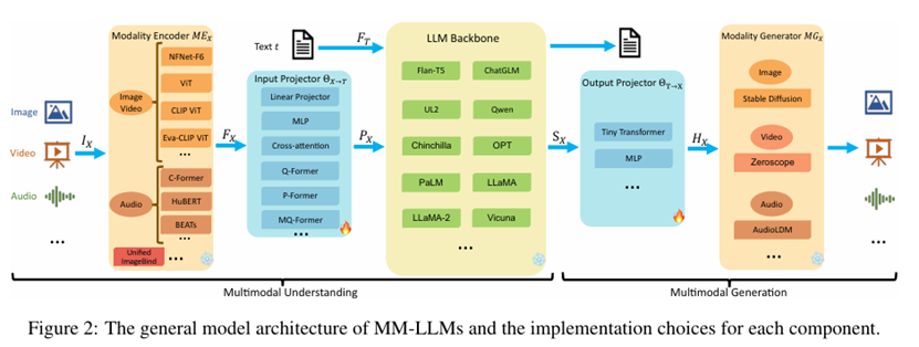在实际应用中,模态生成器需与输入投影器、LLMs 深度协同。以虚拟主播场景为例:LLMs 根据直播主题生成脚本文本,输入投影器将脚本语义转换为视频与音频特征,模态生成器则生成虚拟主播的动作视频与同步语音,最终实现 “脚本 - 内容” 的端到端生成,为多模态交互场景提供高效支撑。