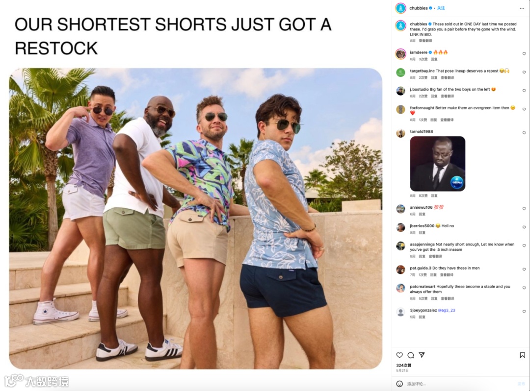 对于中国出海品来说,若能适配当地文化找到恰当的合作对象,完全有机会在全球社媒平台掀起和Chubbies一样的“爆款魔力”。