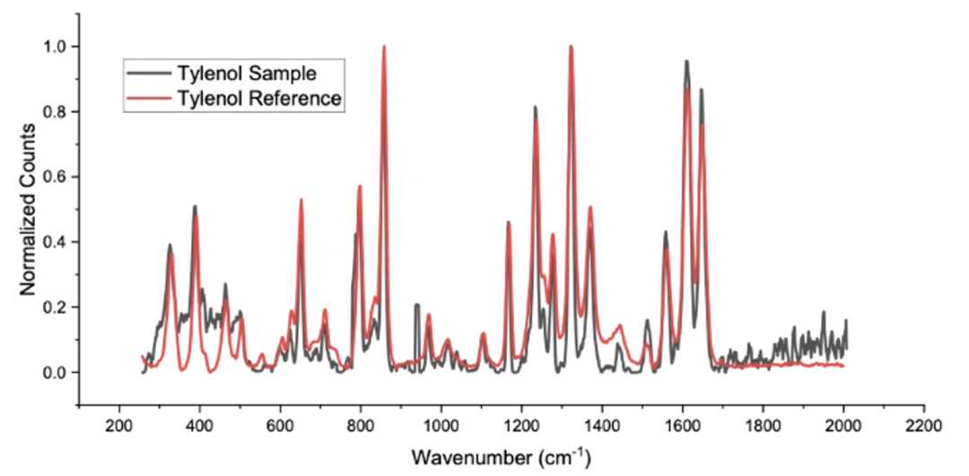 图1:拉曼光谱对比图,显示泰诺样品与参考标准的比较,展示了该技术通过特征性光谱指纹识别药物化合物的能力。