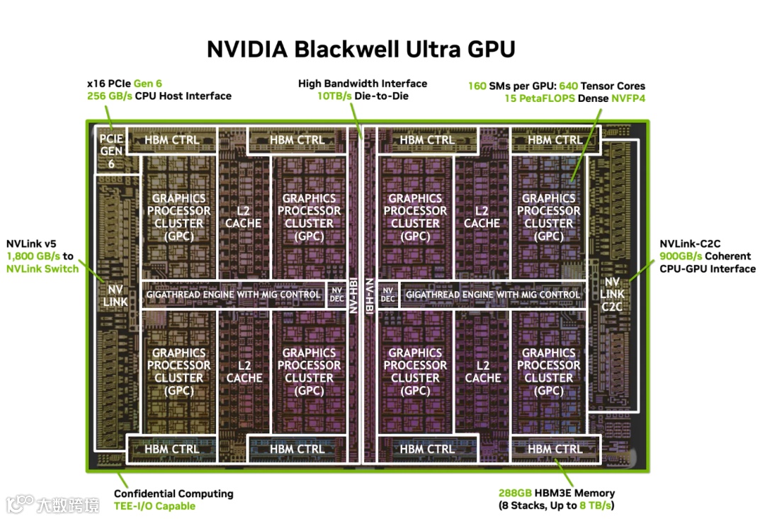图1:NVIDIA Blackwell Ultra GPU的完整芯片架构,包括通过10 TB/s NV-HBI接口连接的双reticle芯片,配备640个第五代Tensor Core以及PCIe Gen 6、NVLink v5和NVLink-C2C等全面的连接选项。