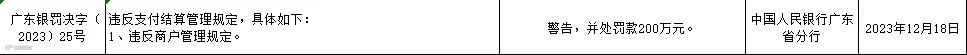 广州银联网络支付有限公司因违反商户管理规定,被警告,并处罚款200万元。