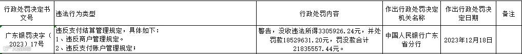 中国人民银行广东省分行近日公布的行政处罚信息公示表显示,广东汇卡商务服务有限公司因违反商户管理规定和违反支付账户管理规定,被警告,没收违法所得3305926.24元,并处罚款18529631.20元,罚没款合计21835557.44元。