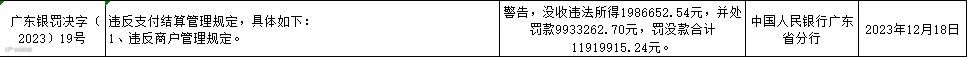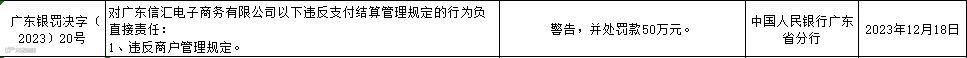 广东信汇电子商务有限公司因违反商户管理规定,被警告,没收违法所得1986652.54元,并处罚款9933262.70元,罚没款合计11919915.24元。