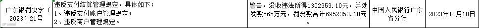 其中,易联支付因违反支付账户管理规定和违反商户管理规定,被警告,没收违法所得1302353.10元,并处罚款565万元,罚没款合计6952353.10元。
