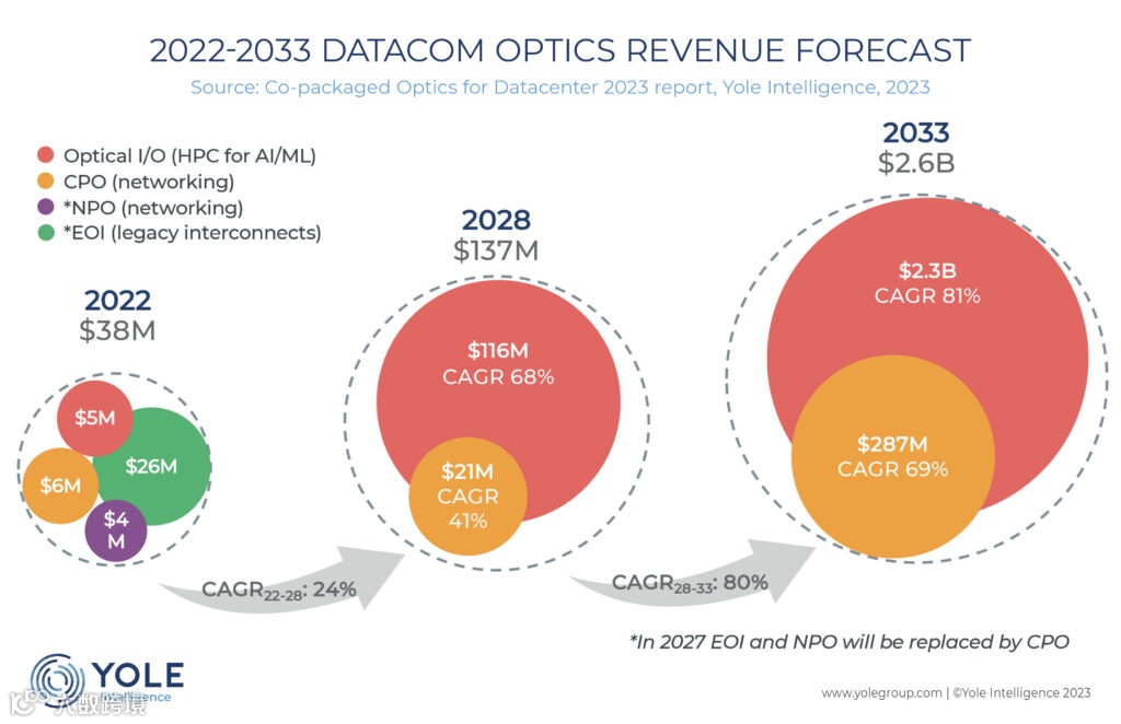 共封装光学器件(CPO)由于其在数据中心的电源效率,最近获得了关注。虽然大多数针对网络应用的CPO的主要支持者,由于宏观经济的阻力而停止了CPO计划,但用于人工智能(AI)和机器学习(ML)系统的CPO的情况却有所不同。人工智能模型对计算能力、存储和数据移动有着永不满足的需求,而传统架构正在成为扩展ML的主要瓶颈。因此,为HPC和新的分布式系统架构,出现了新的光学互连。Yole集团旗下的Yole Intelligence在其新报告《数据中心的共封装光学技术》中对此进行了回顾。用于xPU、内存和存储的封装内光学I/O技术可以帮助实现必要的带宽。此外,未来数十亿个光互连的潜力正在推动大型代工厂为设计公司的任何PIC架构的大规模生产(包括硅光子学工艺流程)做准备。2022年CPO收入约为3800万美元,预计2033年将达到26亿美元,2022-2033年年均复合增长率为46%,受AI/ML装备中数据加速传输的推动。