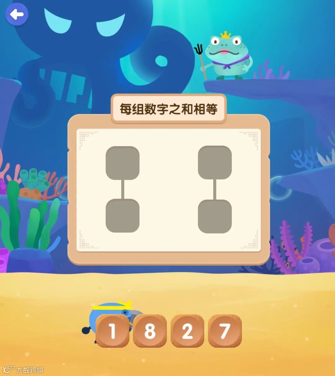 数阵图游戏,孩子们在海底世界完成学习挑战。拖动数字,每组数字之和相等即算挑战成功,对孩子加法运算的逻辑提升有非常好的训练效果。