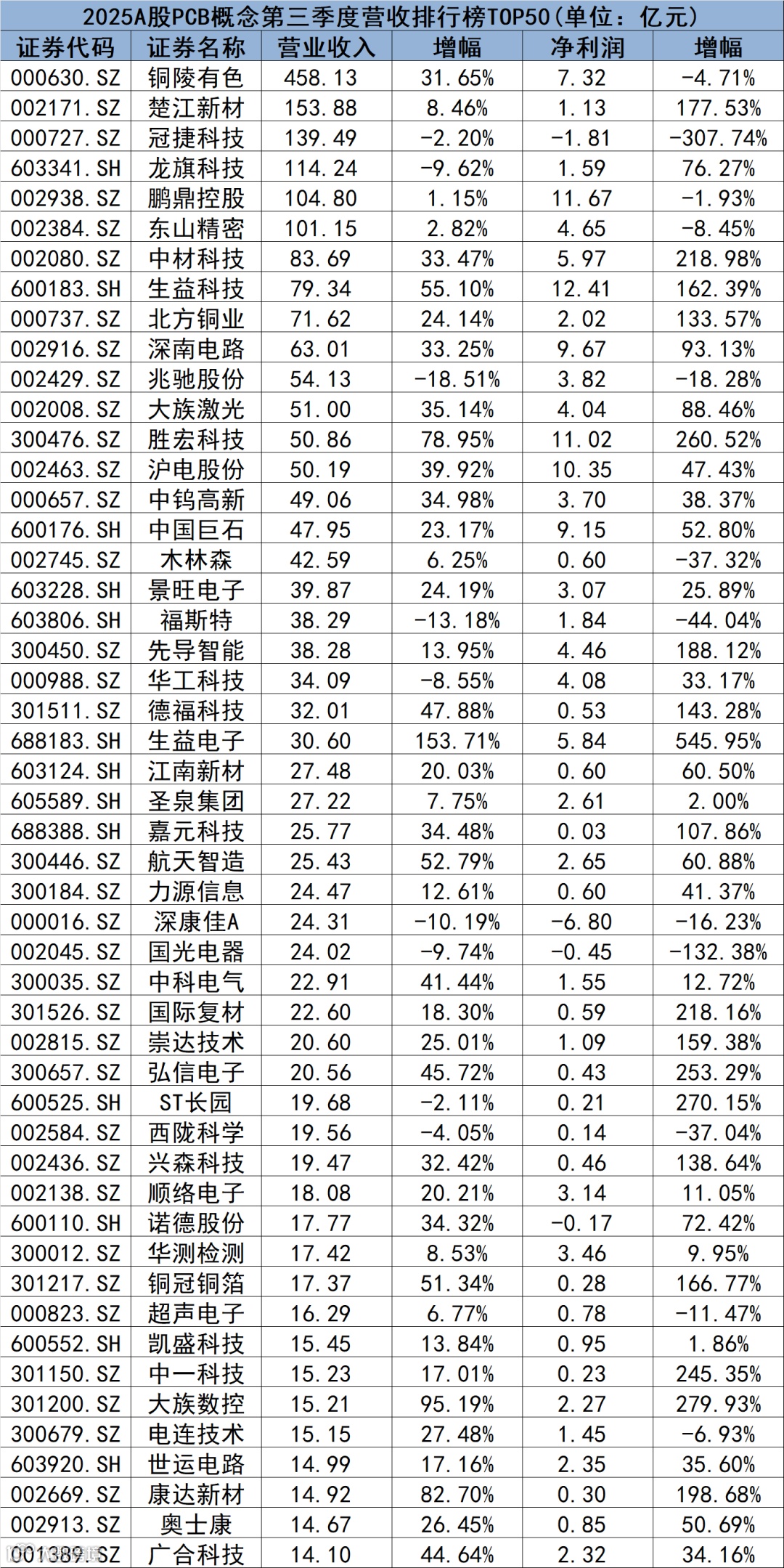 随着 2025 年三季度报披露收官,A 股 PCB 概念业绩排名全景正式亮相。作为电子信息产业核心赛道,PCB 企业的营收、利润表现,直观反映了下游需求(消费电子、新能源等)、技术壁垒与成本管控能力的差异。