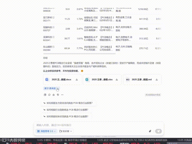 传统 PCB 概念数据整理需跨报表提取营收、净利、下游应用等多维指标,耗时耗力。iFinD Chat通过自然语言交互实现 “一句话取数 + 智能分析”: