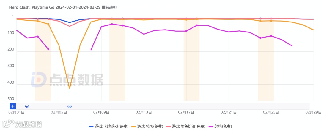 去年9月中旬上线欧洲的《Hero Clash: Playtime Go》是冰川网络又一款典型的副玩法买量作品。然而能频繁上榜全球各地榜单前列也再次验证了这一策略的实用性。根据点点数据统计,该游戏在经历了2月6日的版本更新后便冲上欧洲多地卡牌和角色扮演类别游戏免费榜榜首,且热度一直延续到月底。