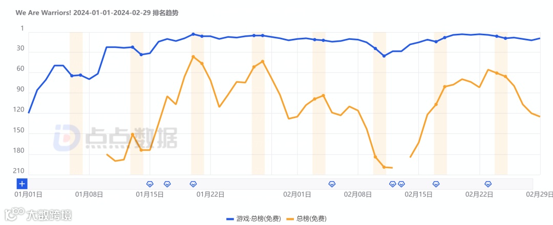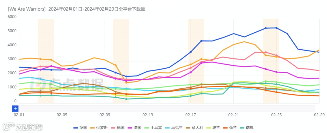 去年11月上线,由曾发行爆款餐厅经营手游《Eatventure》的德国Lessmore UG发行的又一款简单点击+放置货币加成玩法的战争题材作品《We Are Warriors!》于2月迎来在欧洲地区的新月下载纪录。游戏在上线之初并未在各地区榜单取得相当耀眼的成绩,但却凭借简单的玩法与令人上瘾的重复累积升级机制不断吸引新的玩家,数据表现也是逐月上升。
