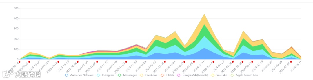 其在2月翻红的原因也是在于其2月6日所更新的转刀割草升级副玩法。总的来看,此种副玩法更新的策略在给予玩家新鲜感的同时也能持续为买量广告提供丰富的素材。而从广大大的买量投放数据也能发现,持续的广告买量投入也是游戏能够频繁翻火的重要原因之一。