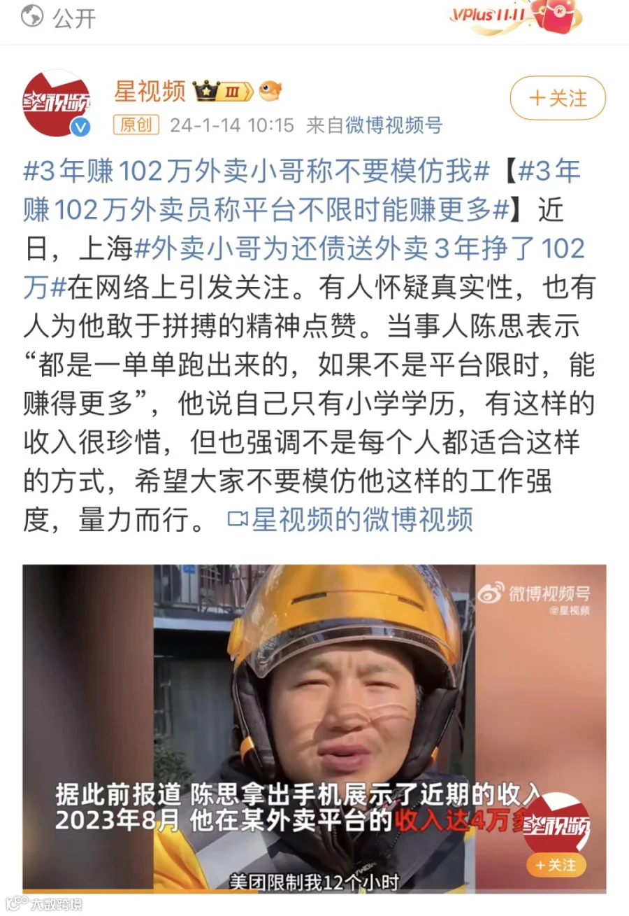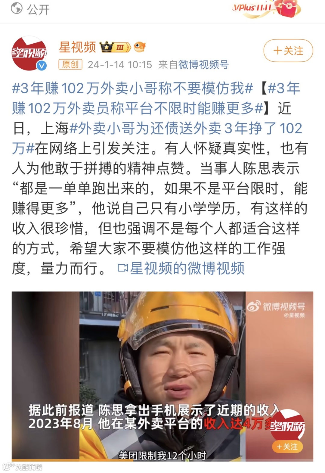 近日,一位外卖小哥陈思在网上曝出自己在上海送外卖3年挣了102万的消息便马上冲上了热搜。网友议论纷纷,其中不乏有人质疑他收入的真实性,也有人表示担忧他的身体状况。