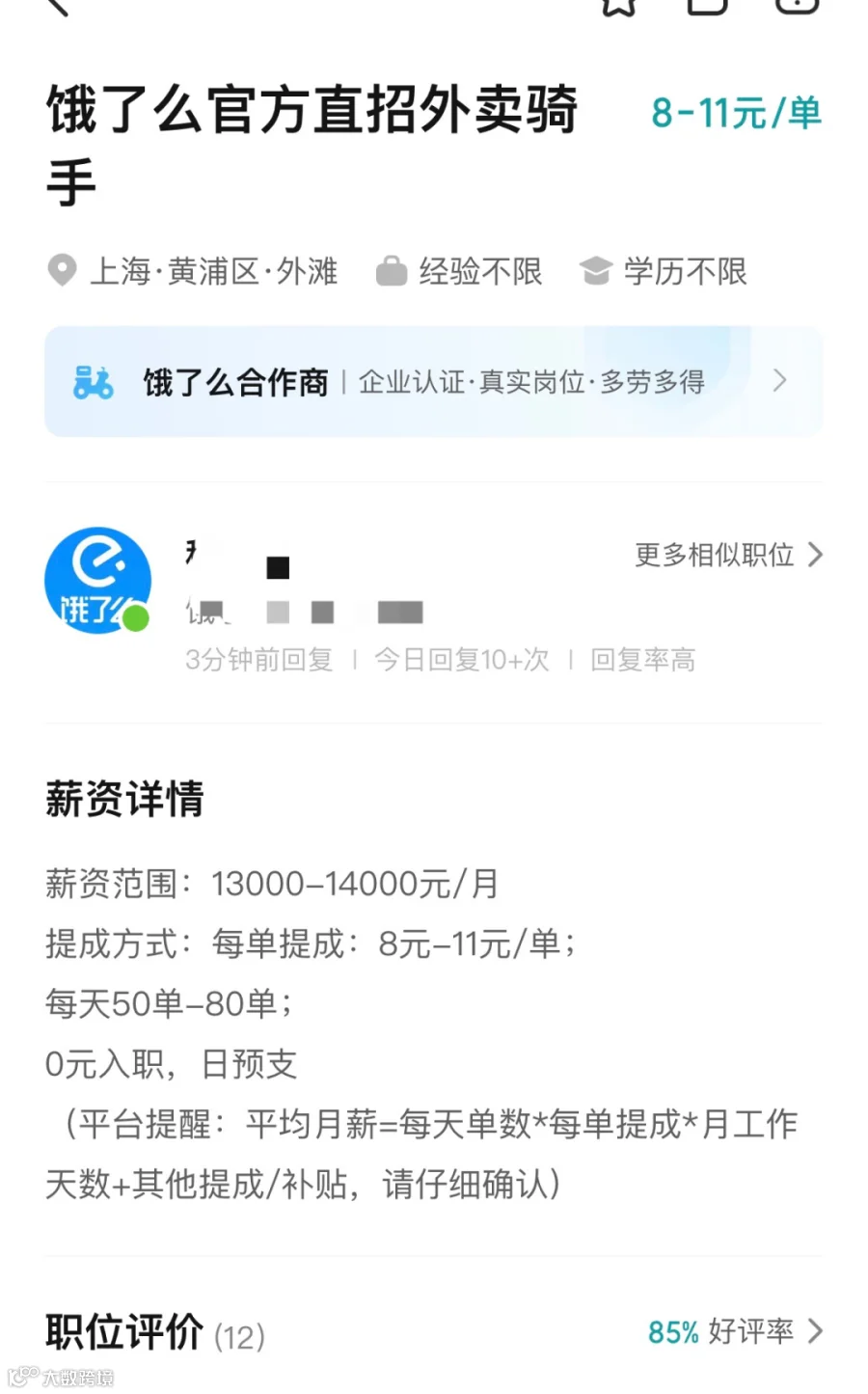 图源:截自招聘平台饿了么平台招聘信息显示,外卖员薪资范围为13-14k/月,每单提成8-11元/单;每天50-80单。