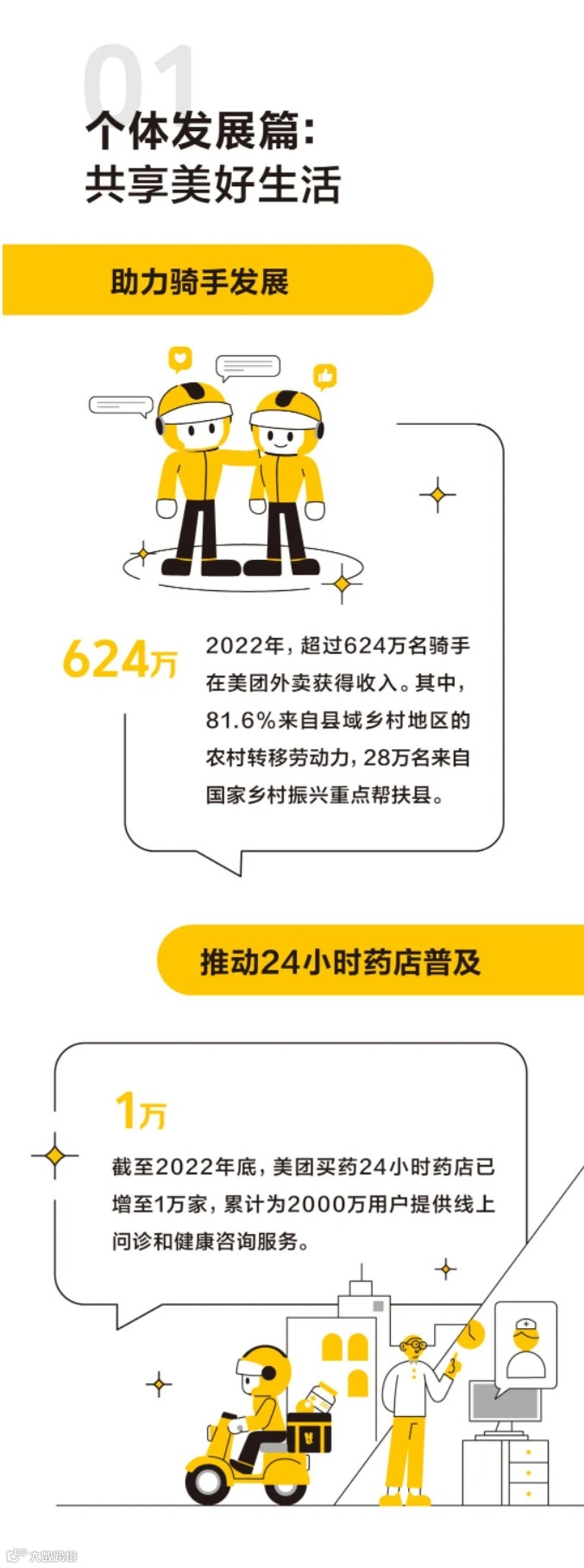 根据美团发布的《美团2022企业社会责任报告》数据显示,2022年,超过624万名骑手在美团外卖获得收入。其中,81.6%来自县域乡村地区的农村转移劳动力,28万名来自国家乡村振兴重点帮扶县。