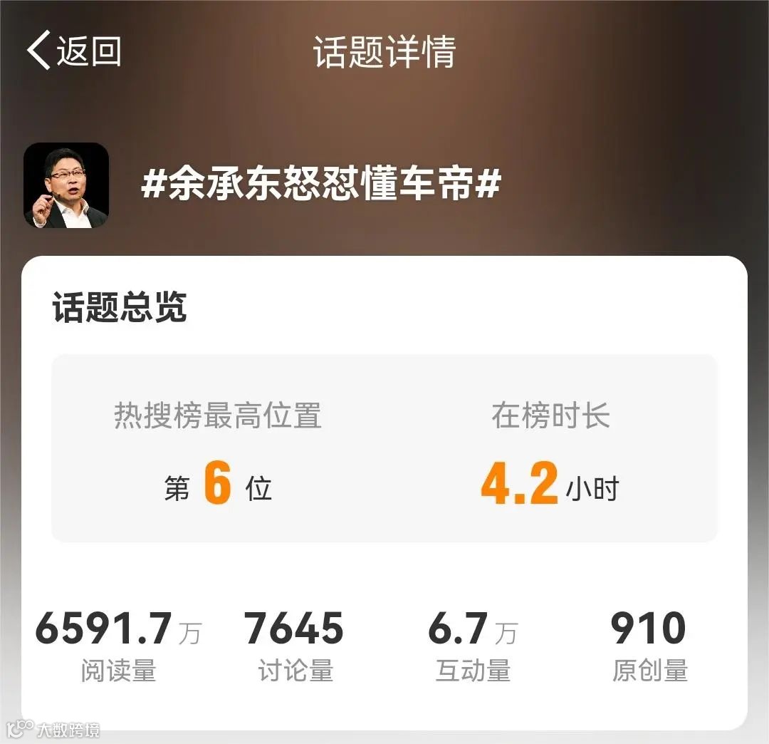 事情是这样的,近期懂车帝发布的一场汽车冬季测试。然而在测试结果出来,华为问界M7增程版续航达成率只有31.6%,排名倒数第一。随后余承东发朋友圈称,这是“坑人的测试,误导民众!”