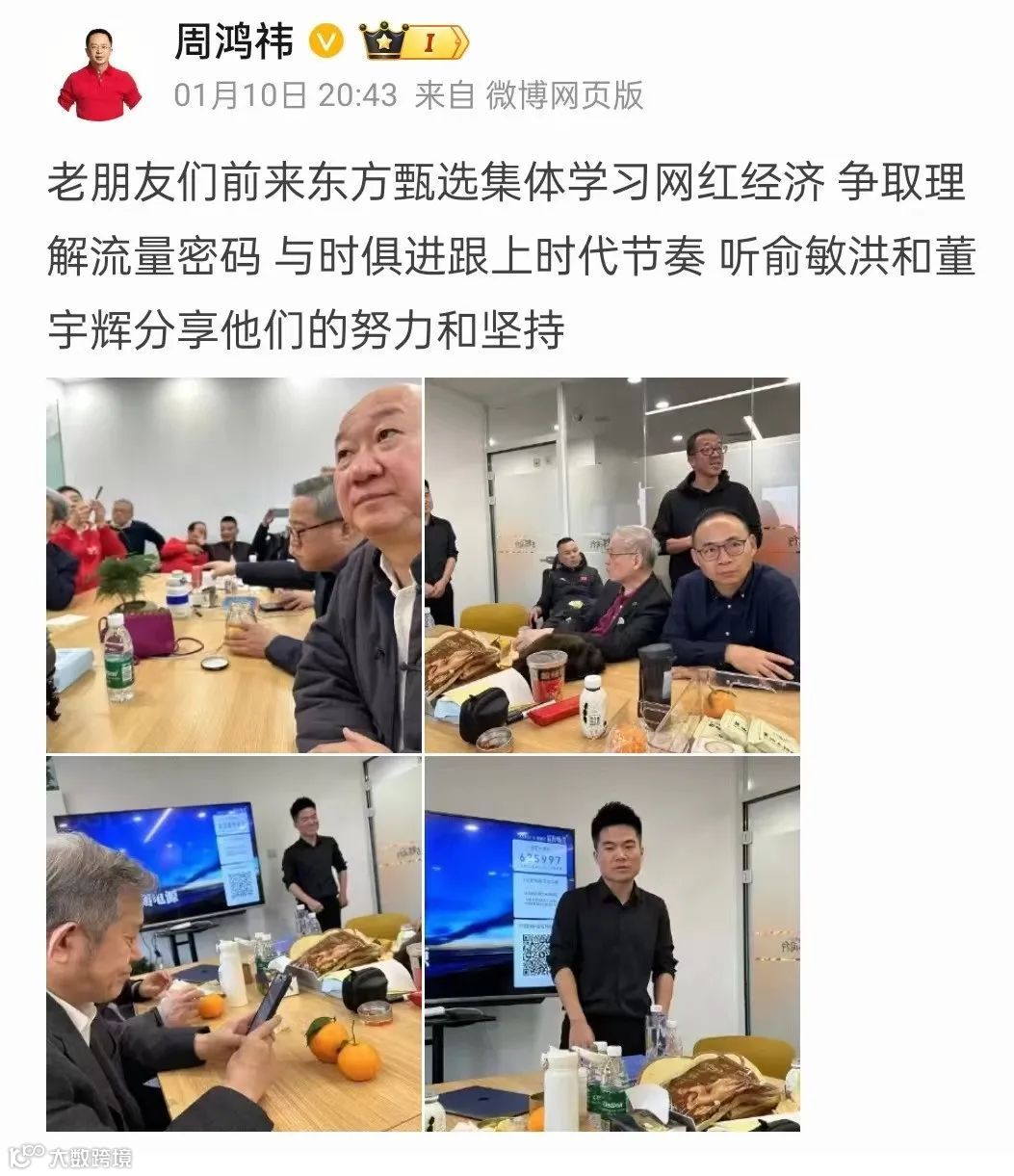 1月10日晚,360创始人周鸿祎、民生银行创业董事冯仑、新希望集团创始人刘永好、泰康保险创始人陈东升等十余位知名企业家来到了东方甄选总部,找董宇辉“取经”,学习东方甄选的成功之道。