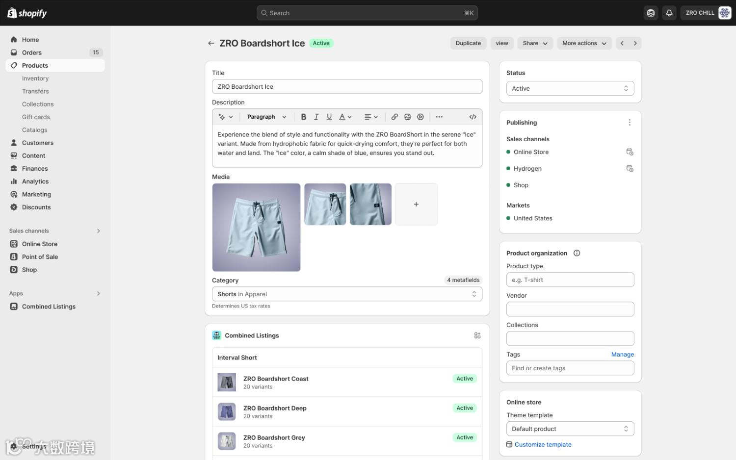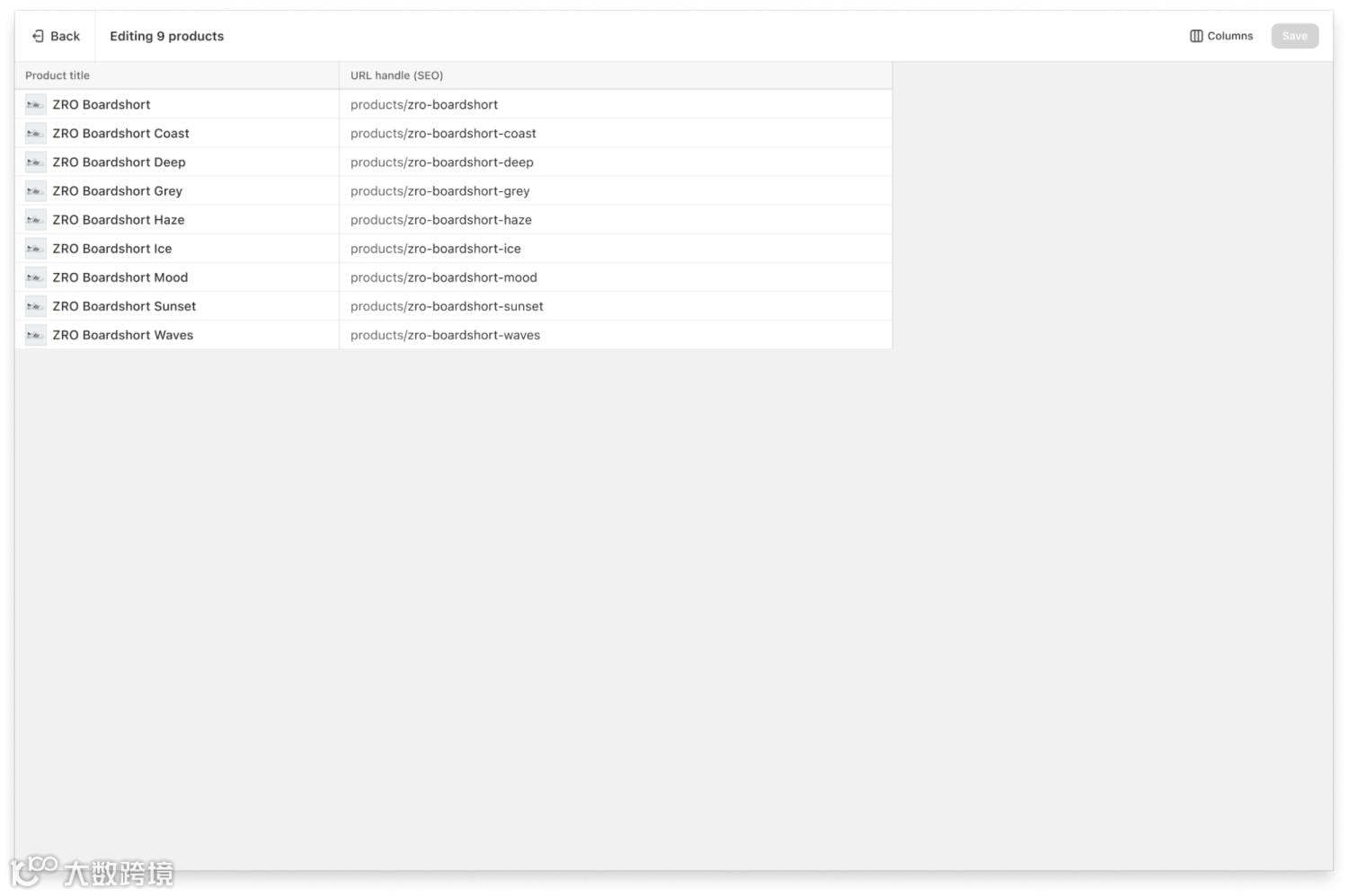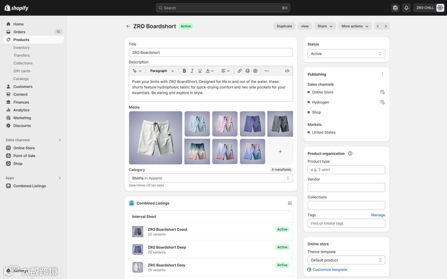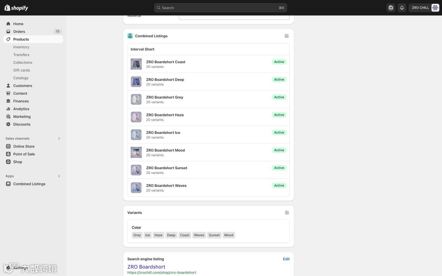 接下来,你可以设置特定的URL,作为所有产品的规范URL,以避免在谷歌排名系统中出现重复。你可以为组合列表中的每个单独选项,设置专属的描述性URL——例如,www.yourstorename/products/zro-boardshort,这对营销和SEO很有帮助。