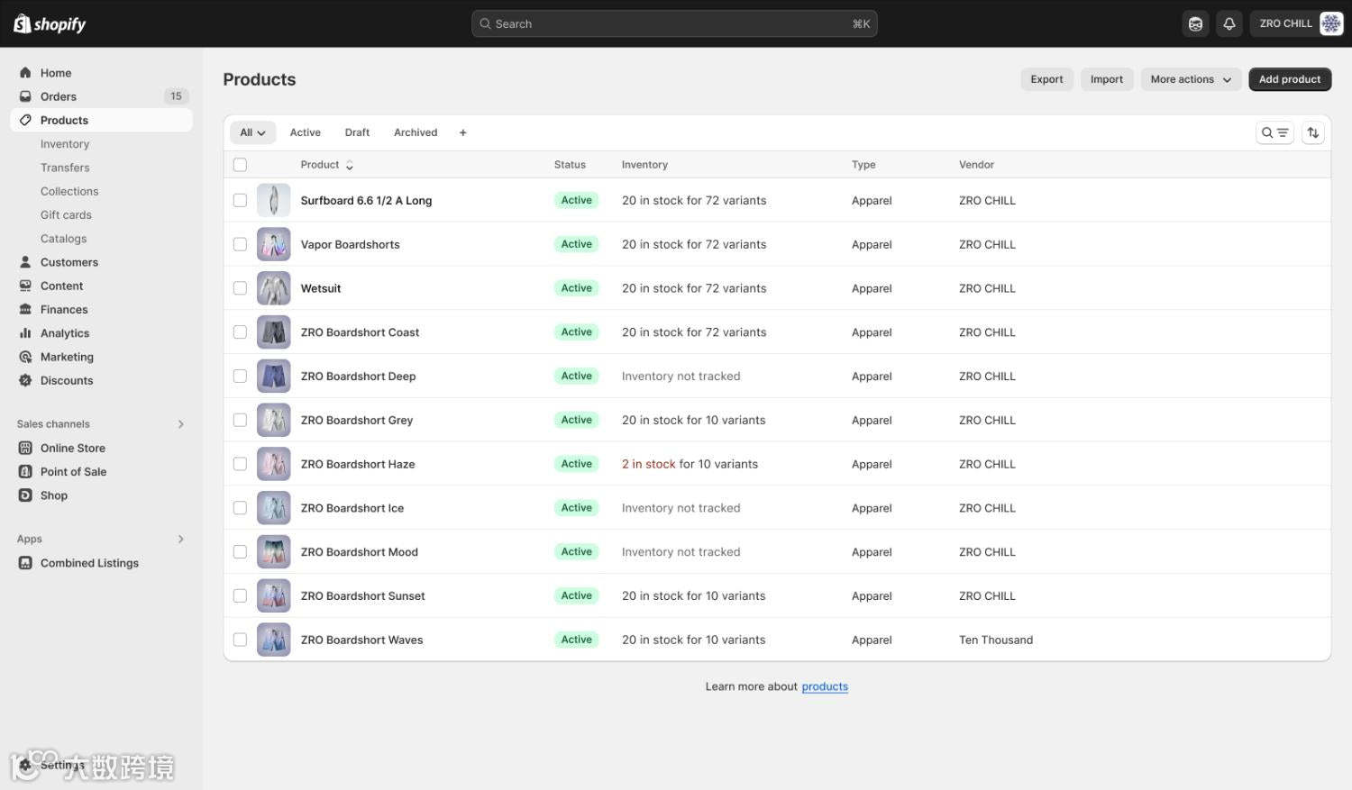 在创建第一个组合列表之前,你需要在Shopify后台的产品页面中,创建代表组合列表中各个变体的产品。例如,在创建热销短裤的组合列表之前,你需要在Shopify后台,将每种配色作为独立产品创建。如果你已经是Shopify商家,你可能已经创建了这些产品,那么可以跳过第一步。