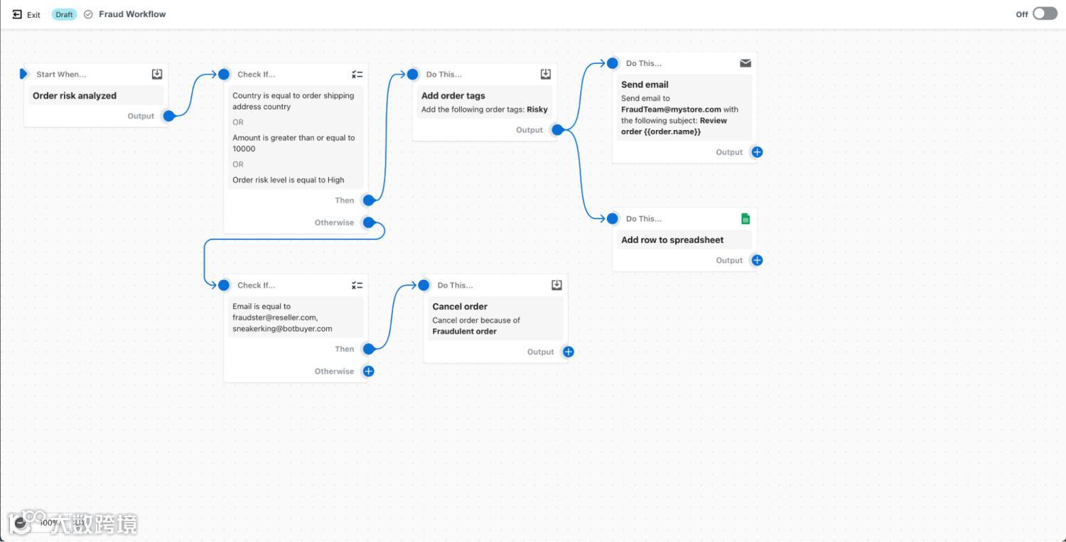 更棒的是,在同一个工作流程中,Shopify Flow让商家可以构建其他的风险管理分支,比如,如果订单来自被列入黑名单的电子邮箱地址,Shopify Flow将自动取消订单。