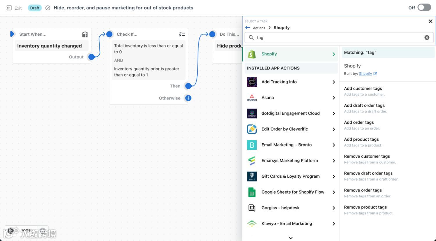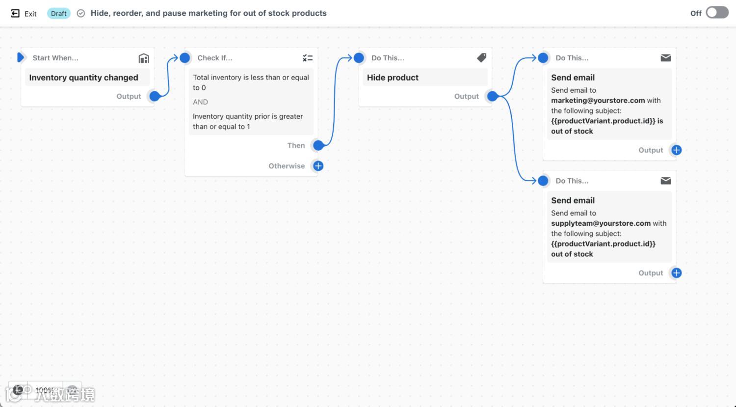 除了高级条件逻辑外,Shopify Flow还允许商家确定自动化流程中的具体操作顺序。如果你想在启动重新订货或提醒营销团队切换到新的广告活动之前,先隐藏缺货的商品,这项功能就显得尤为重要。