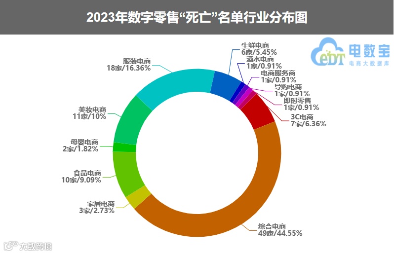 从行业分布上来看,综合电商“死亡”数量最多,达到49家;服装电商18家,位于第二;美妆电商11家,位列第三。