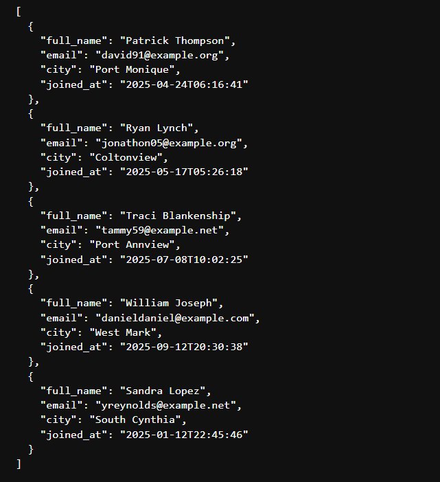 Faker 很适合为数据库播种(seeding)或 mock API payload。它速度快且不依赖网络。在以 Python 为主的项目(如 Django、FastAPI)中进行测试时,它往往是最实用的选择。