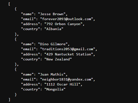 输出非常真实,会匹配所选 locale 的地址格式和姓名。你只需把 'en' 切换为 'fr''de' 或 'ja',就能立即按地区生成相应数据。