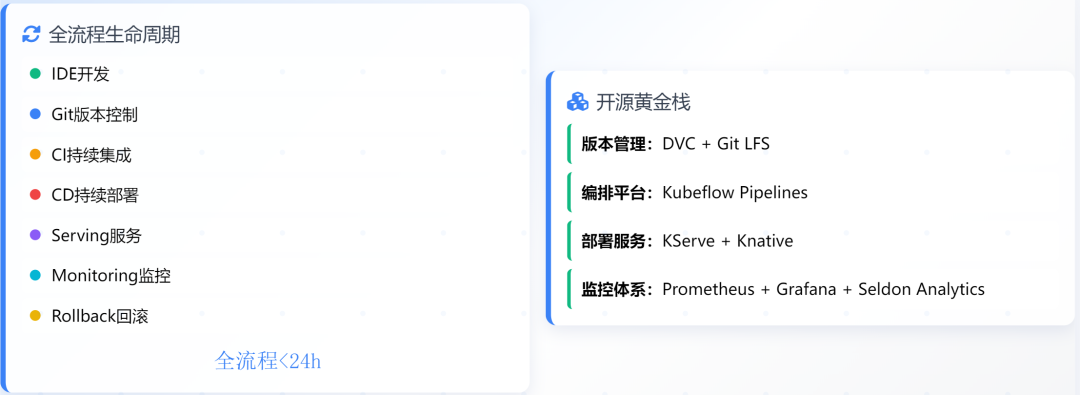 要实现AI模型的快速迭代,一个端到端的MLOps工具链至关重要。这些工具链通常基于Kubernetes构建,并与微服务架构深度集成。一个典型的开源MLOps工具链包括: