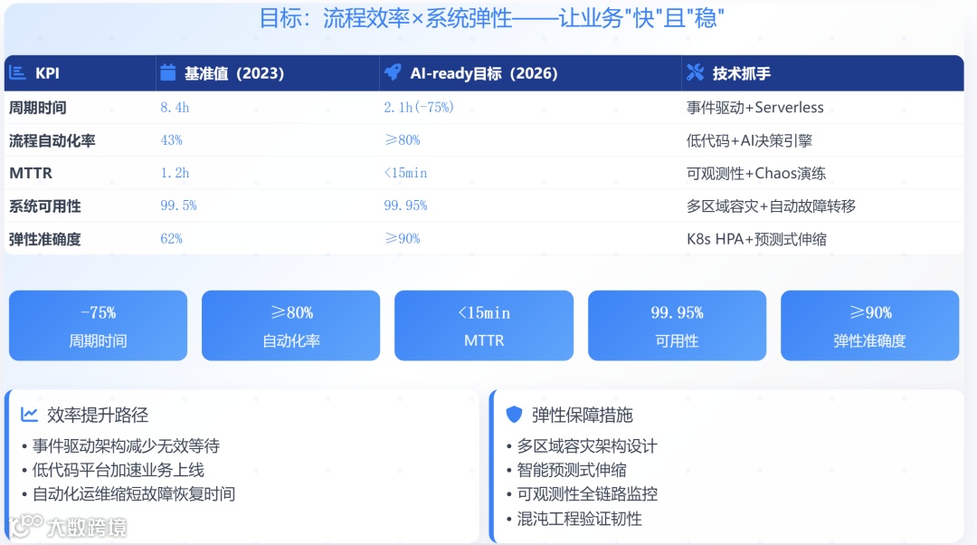 目标阐述:通过自动化、优化和重构业务流程,减少人工干预,缩短业务周期时间,从而提升整体运营效率。AI的引入使得从"流程自动化"向"流程智能化"转变成为可能。