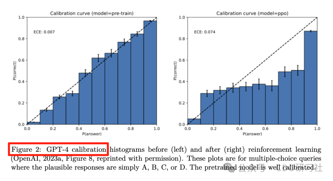 Figure 2:GPT-4预训练模型(左)原本校准良好;RLHF后(右)明显过自信