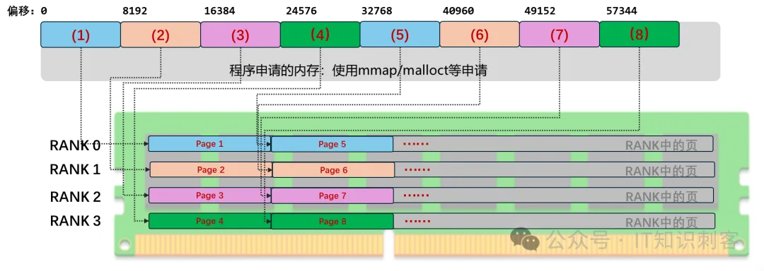 如图1所示,程序申请了一块内存,这块内存以8KB为单位,分布在内存条的4个RANK中。