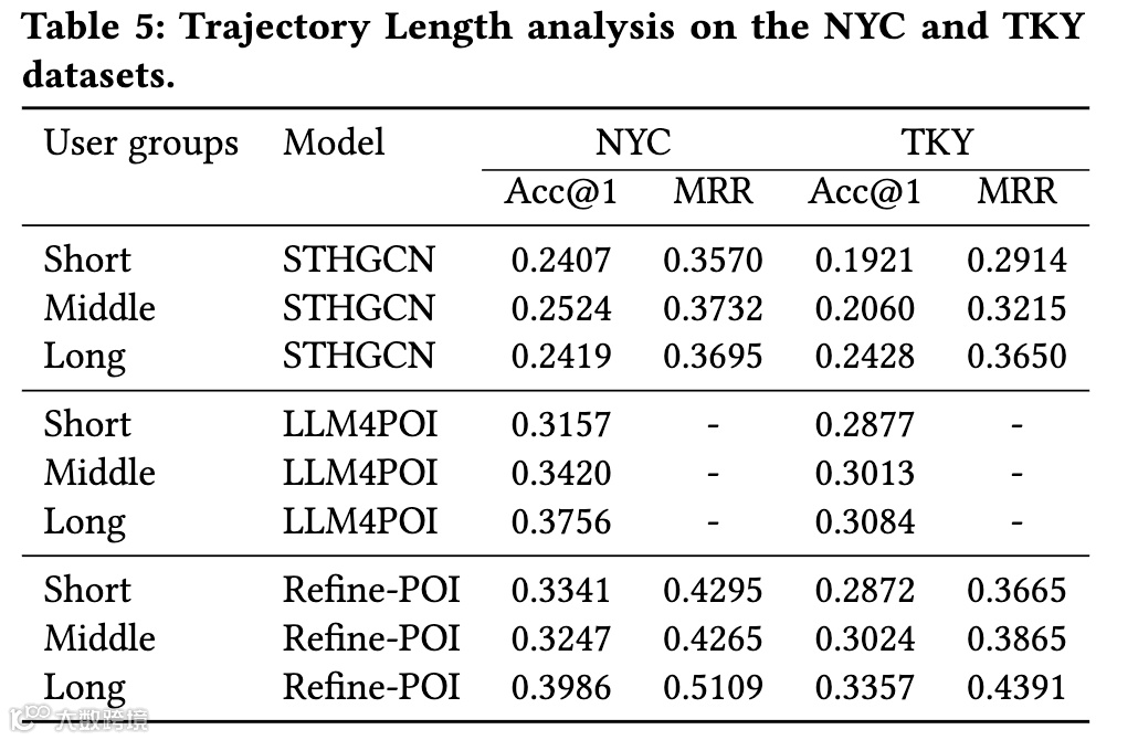 用户冷启动分析中,Refine-POI展现了处理非活跃用户的优秀能力。研究根据训练集轨迹数量将用户分为非活跃、正常和高活跃三组,前30%为高活跃,后30%为非活跃。结果表明,Refine-POI在NYC数据集的非活跃用户群体中实现最佳性能,证明其在冷启动问题处理上的有效性。轨迹长度分析中,研究将轨迹分为短、中、长三类,结果显示Refine-POI在短轨迹和长轨迹上均优于基线方法,其在长轨迹上的显著优势体现了从丰富数据中提取insight的强大能力。