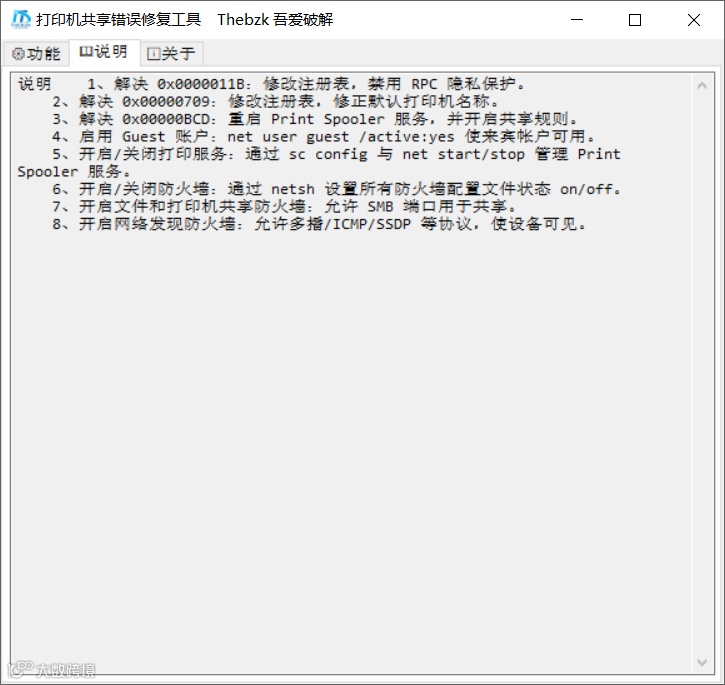 这是一款打印机错误一键修复工具,由吾爱大佬原创,大小仅238KB,单文件免安装,点击对应的报错功能即可修复。