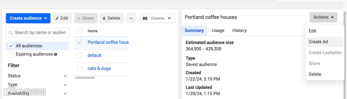 您可以使用您建立的受众群体作为广告的目标受众群体。返回广告管理器并选择您想要定位的受众群体。单击“操作”下拉菜单并选择“创建广告”以放置针对该特定组的广告。