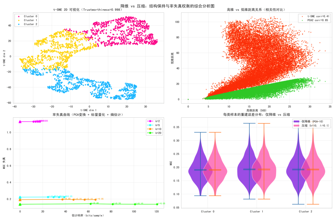 plt.suptitle("降维 vs 压缩:结构保持与率失真权衡的综合分析图", fontsize=14)