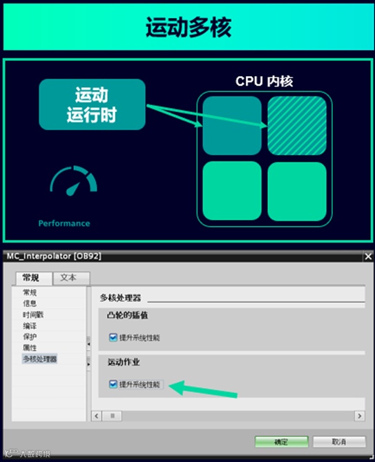 自固件版本V4.1起,S7-1500T CPU通过‘提升系统性能’功能,可利用其多核处理器,将复杂运动控制应用的CPU处理时间缩短最高30%。