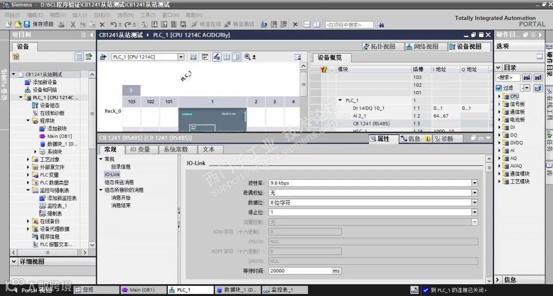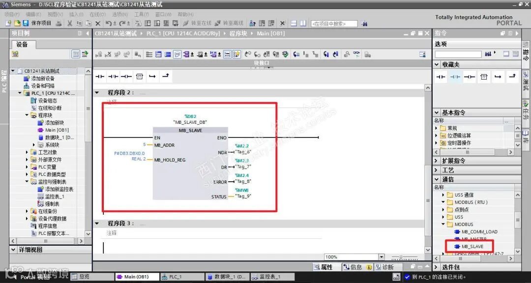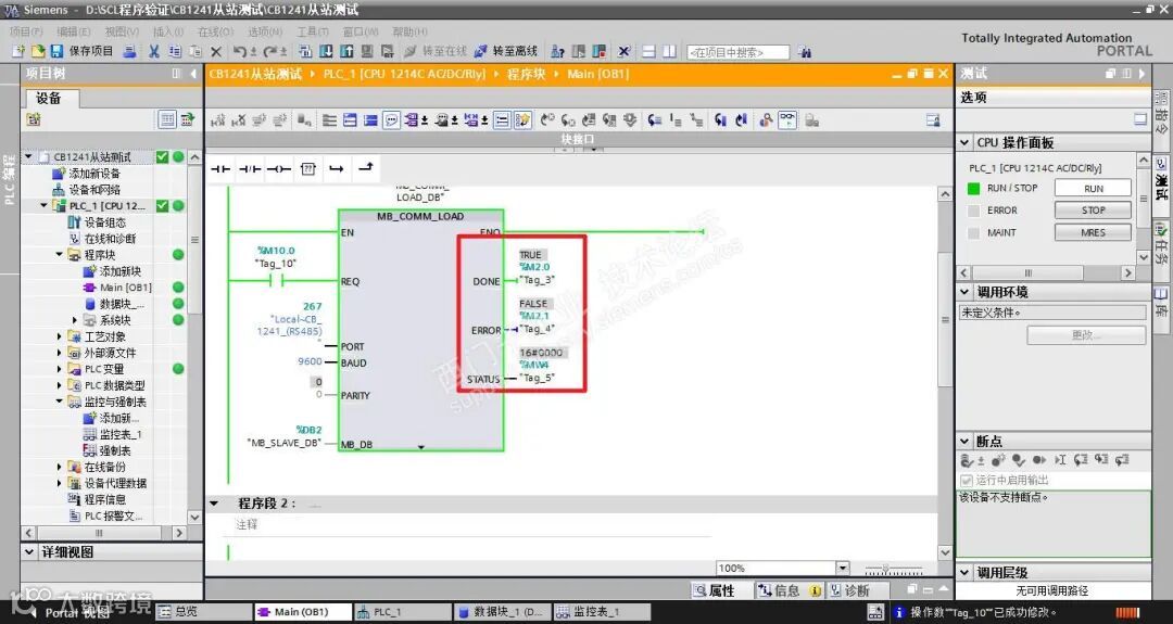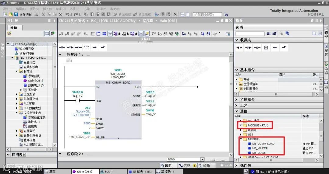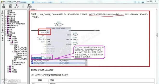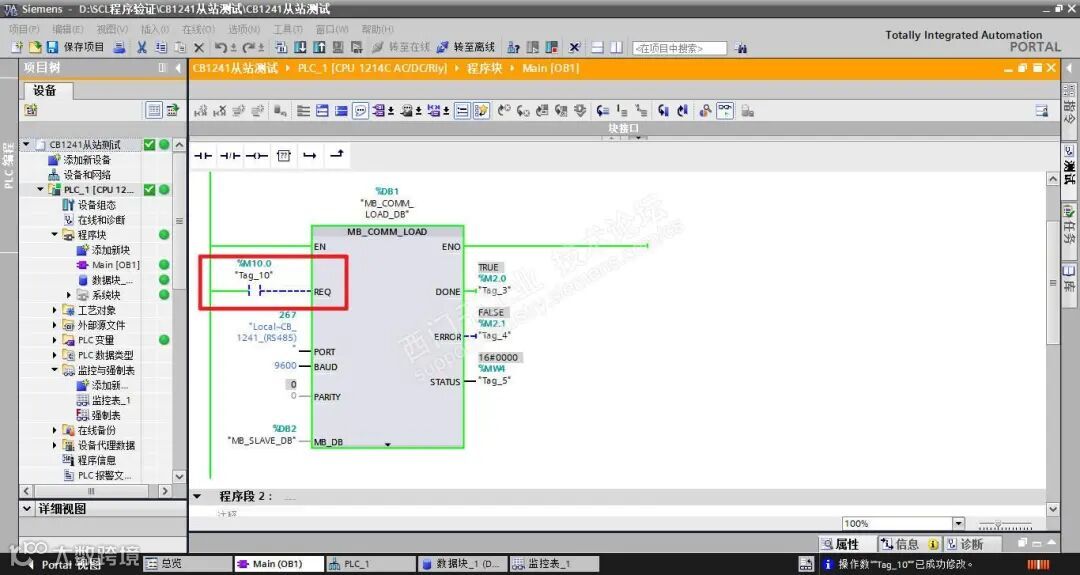 OB100的MB_COMM_LOAD的REQ管脚TRUE,是建立在OB100,相当于沿触发,而我在实际应用是OB1中调用,正确应用应该是沿触发,修改M10.0 = 0,也相当于沿触发。如果没有将M10.0设置为0,相当于每应该周期始终初始化,由此与串口调试软件通讯不成功。
