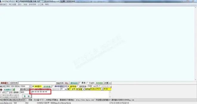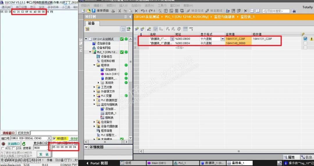 6) 启动串口调试软件,设置相同的通讯参数,在发送器编辑读取5#从站的DB3.DBD0和DB3.DBD4的数据,16#进制数表示,图示: